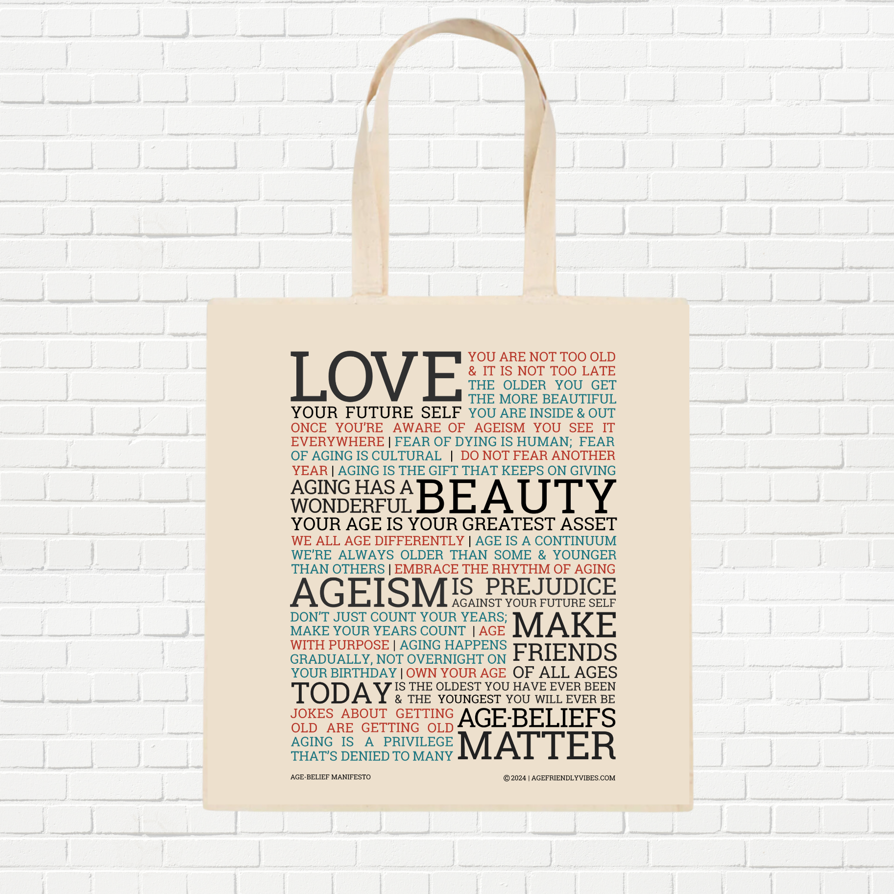 Spread age-positivity with this high quality, 100% cotton canvas tote, featuring the Age Belief Manifesto.