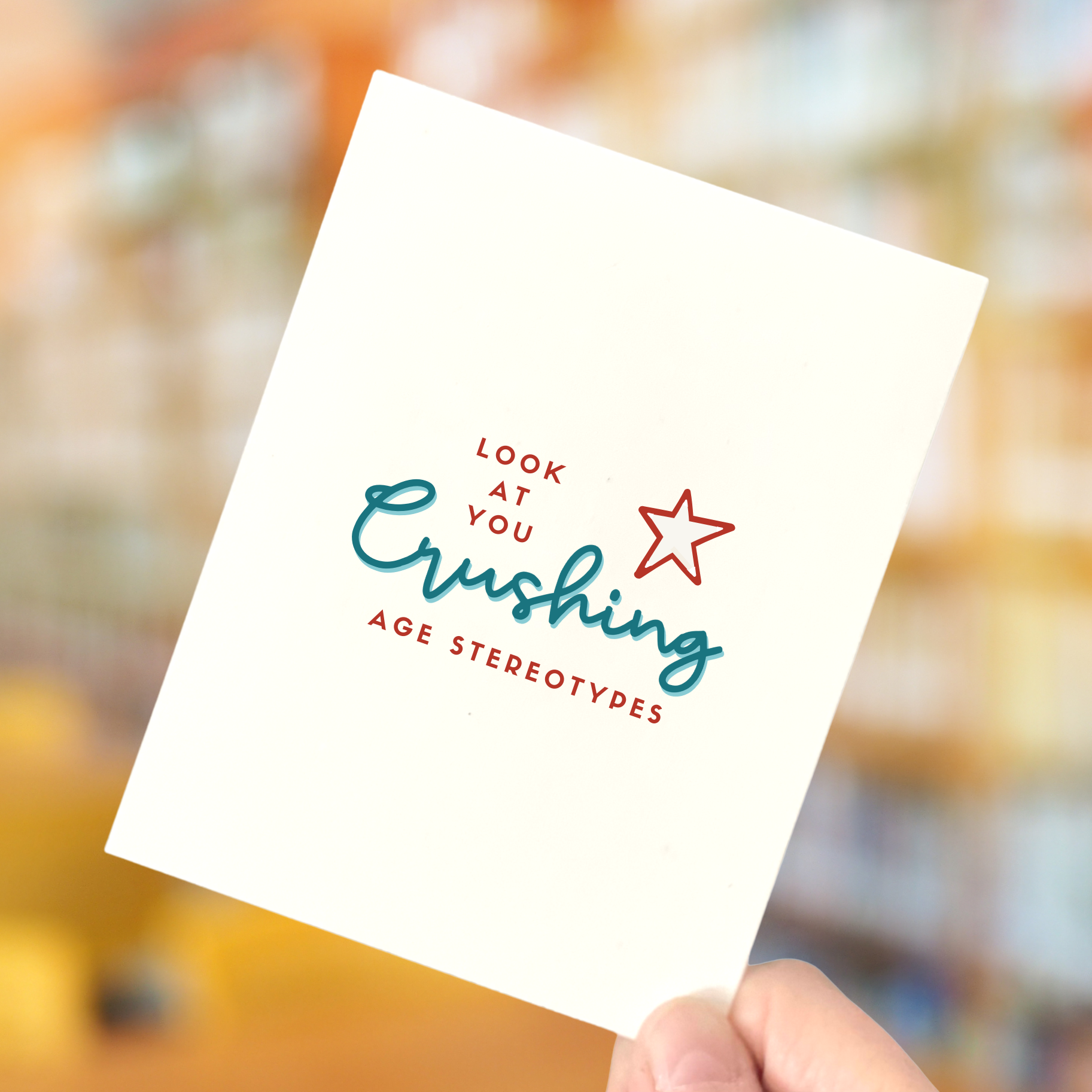 - Single-fold greeting card, featuring age-positive designs